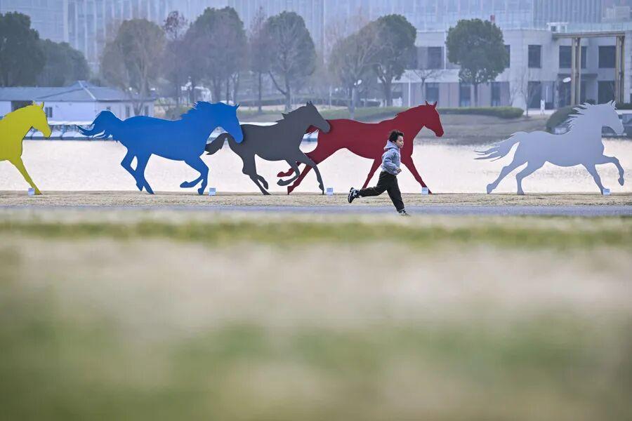 閔行文化公園內的“萬馬奔騰”雕塑沿着湖邊一字排開,彷彿能聽見馬蹄踏風的震撼