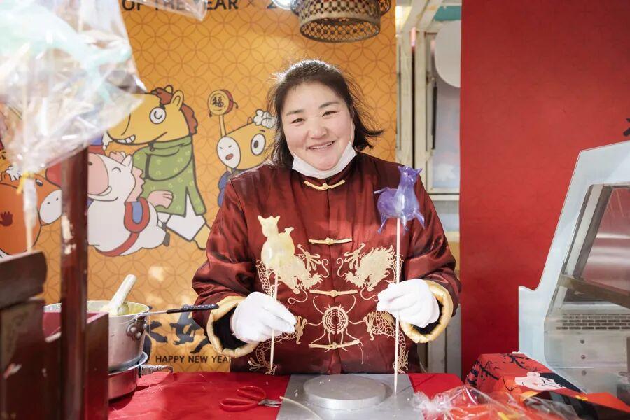 靜安久光步行街上,商家正在展示非遺吹糖人