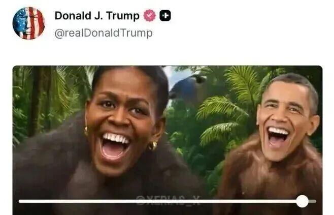 特朗普的社交媒體賬號5日夜間發佈一段涉及前總統奧巴馬及其夫人米歇爾的視頻片段。視頻中存在兩個靈長類動物的畫面,它們的臉被剪輯成了奧巴馬及其夫人米歇爾的笑臉。該視頻片段涉嫌種族歧視,引發各方強烈不滿和譴責。白宮方面6日將視頻刪除,距其發佈已過去10餘小時。