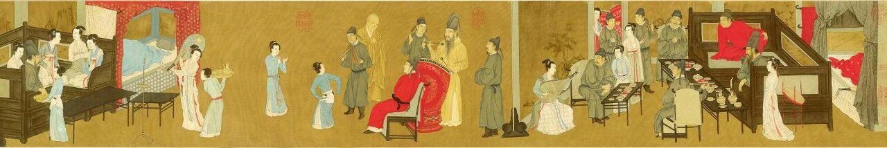 最負盛名的是南唐畫師顧閎中《韓熙載夜宴圖》,這幅作品無疑是這方面最驚心動魄的見證。因爲在藝術史上,它不僅是一幅藝術傑作,更是一份政治情報,源於南唐後主李煜對大臣韓熙載的猜忌。畫師顧閎中奉命偷拍,但他並沒有簡單記錄實景,而是利用手卷這一媒介,構建了一個精妙的時間與空間迷宮。