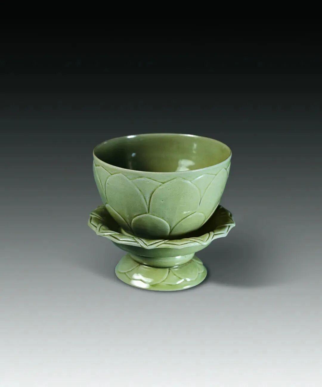 這件祕色瓷蓮花碗的意義,也遠不止於政治。祕色瓷的釉色青綠,如冰似玉,蓮花碗身那一圈浮雕蓮瓣,如在靜水中緩緩綻放。九秋風露越窯開,奪得千峯翠色來,最絕妙的是,哪怕碗裏是空的,看着也像盛滿了盈盈清水。在戰火紛飛的年代,這種美學標準的確立是驚人的。它不再追求唐代那種外向的、絢爛的裝飾,而是轉向了內省,追求一種抽象的質感與純淨的意境。