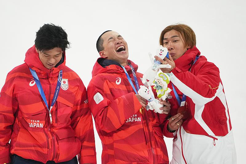 蘇翊鳴在自拍合影環節逗得兩位日本選手哈哈大笑
