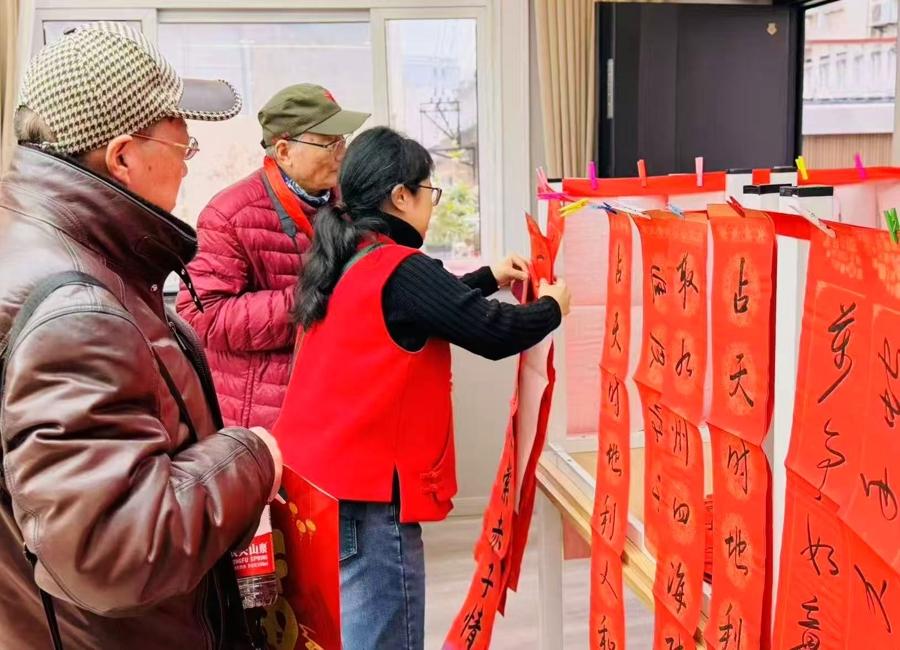 現場,來自虹口區文化館的書法幹部與殘障書法愛好者同臺揮毫,即興創作。一幅幅寓意吉祥的書寫“福”字與春聯作品完成後,送給到場的殘障人士,用傳統年味傳遞溫暖關懷。此外,遊園會還設有紅包拓印、扎染共創等非遺手作體驗。