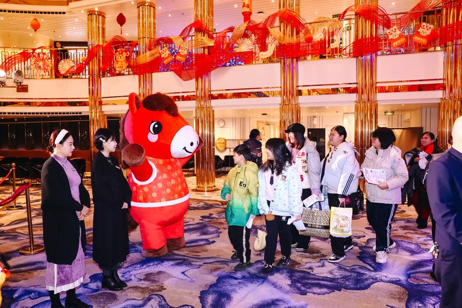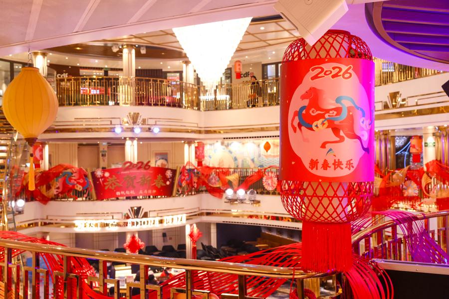 8日,“愛達·魔都號”上處處可見燈籠、中國結,新春氛圍濃厚。“幸運兒”李女士告訴記者,她這次帶着全家出遊選擇“愛達·魔都號”是因爲“一直對我們的國產大郵輪充滿好奇,想親身體驗一番,”同時船上敦煌主題演出、傳統文化展示等活動安排和豐富的中餐選擇,讓她覺得“更合全家人口味。”