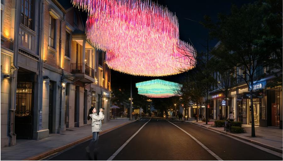 內容:漫步茂名北路,邂逅頭頂的“福祿壽禧財”五福光影。鐳射流蘇垂墜隨風輕舞,在陽光照射下呈現斑斕光影與動態閃爍效果;夜幕降臨時,中國傳統的葫蘆、壽桃、方勝、銀錠、海棠等吉祥紋樣,匯以新穎的材料和光影技術手段,讓這個作品在白天和夜晚形成不一樣的精彩,新春假期走過“五福”裝置,給新年增添好彩頭。