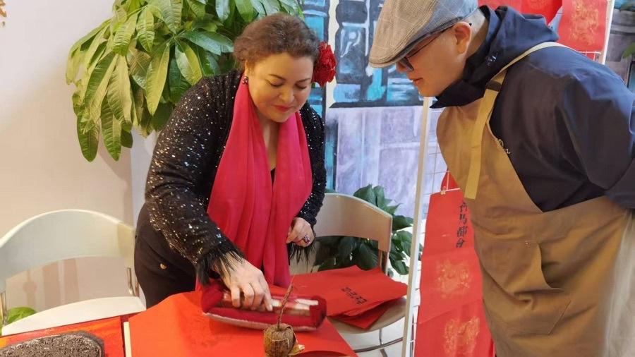 在一樓非遺互動體驗區,寫春聯、送福字、古法拓印等攤位吸引外國友人們體驗。安娜·埃弗努已經在上海生活了28年,也在這裏過了28個春節。此前,她在嘉興路街道參加過2次法語歌曲大賽,在這次大聯歡現場她演唱了一首法語歌曲《玫瑰人生》。她感到,不同文化背景的人在上海都能被真誠接納,尤其是這些年,春節前後她常常接到迎新活動邀約前去觀演、表演,認識了很多朋友,“我很喜歡在上海過年的氛圍,今年準備約在上海的朋友們一起逛街遊玩”。