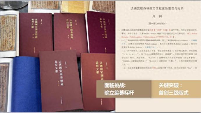 盛潔形容,做《法國國家圖書館藏敦煌文獻》的日子,就像西天取經,九九八十一道關,不知道下一關何時跳出來。其中,原始資料的整理關、叢書體例的創立關、高要求的技術還原關尤其令人直面編輯過程的艱辛。比如,當結束了8個月版權拉鋸,盼來法方郵寄的高清圖版後,團隊遭到當頭一棒——6000多個文件夾上,沒有任何伯希和編號,全是沒有規律的機器流水號,彷彿一套沒有圖紙的樂高拼圖,求助法方也得不到解決。“面對57000多張圖版,我們請老編審府憲展指導,自己動手,從頭整理。四個月集中整理終於完成了,但更可怕的情況出現了。有800個編號內容全部丟失,如果找不到,整個項目將會停滯。壓力籠罩下,大家從早到晚查資料想辦法,有時想到半夜,都會突然驚醒。終於神奇地發現,法圖網頁地址與這些號碼有部分對應關係,再次找到了6000多張圖版。而這仍不是全部。我有一個本子,記錄了三年多來與榮教授和編委們討論積累的580多個新資料問題,包括法國都遺漏已久的彩色整卷、附屬編號殘片、印章、背面文字、民族語言文獻等等。”