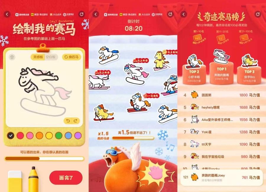 此次新春企劃突破傳統新春活動模式,深度貼合年輕羣體潮玩需求,精心打造專屬玩法,例如用戶可發揮創意,手繪專屬賽馬形象。而且只需分享活動,即可參與幸運抽獎,有機會贏取廣州熱雪奇蹟滑雪券、六福珠寶運財墩墩馬等重磅好禮;“奇蹟賽馬榜”前100名實力玩家,更可額外斬獲酷狗概念版暢聽VIP專屬獎勵,讓馬年好運與悅耳旋律一路相伴。