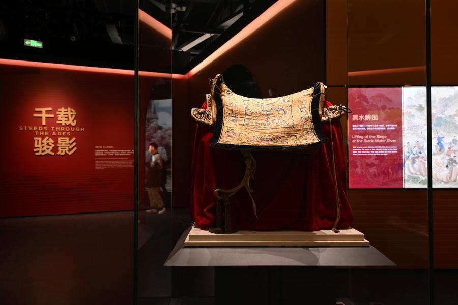 在“千載駿影”展區,27件來自故宮博物院的馬主題珍貴文物首次集中亮相上海。從漢唐到明清,從鞍轡兵器到禮器畫軸,展品中不僅有漢代陶彩繪馬頭、唐代三彩馬、三彩胡人騎馬狩獵俑、銅“聖旨”合符、銀虎鈕“鑲黃旗護軍統領印”等珍貴文物,還有《平定伊犁回部戰圖冊》《萬吉驦軸》等珍貴畫卷的數字影像,以及《乾隆帝盔甲乘馬圖》《郎世寧萬吉驦軸》等數字展品,生動展現馬在歷史中的多元意義。