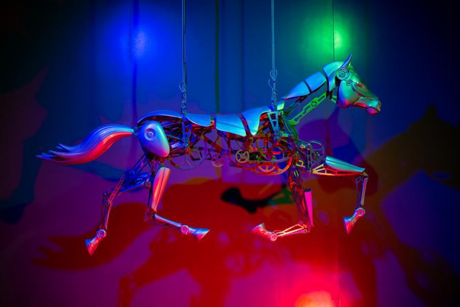 展覽尾聲,一匹由500多個精密金屬構件組成的仿生機械馬尤爲引人注目。該裝置採用工業級3D打印一體成型技術,精確復現了馬的骨骼結構與肌肉線條。而且,這匹掛在半空的機械馬可通過毫米波雷達感知遊客的靠近並開始疾馳。