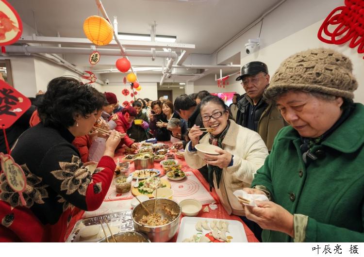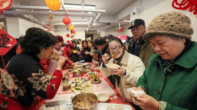 “大年初三最熱鬧,親戚都來我家,長輩坐一桌,小輩一桌。”68歲的居民幹蘭娣手巧,一樣一樣親手操持着過年:春捲、湯圓、八寶飯、餃子,全是自家制作。