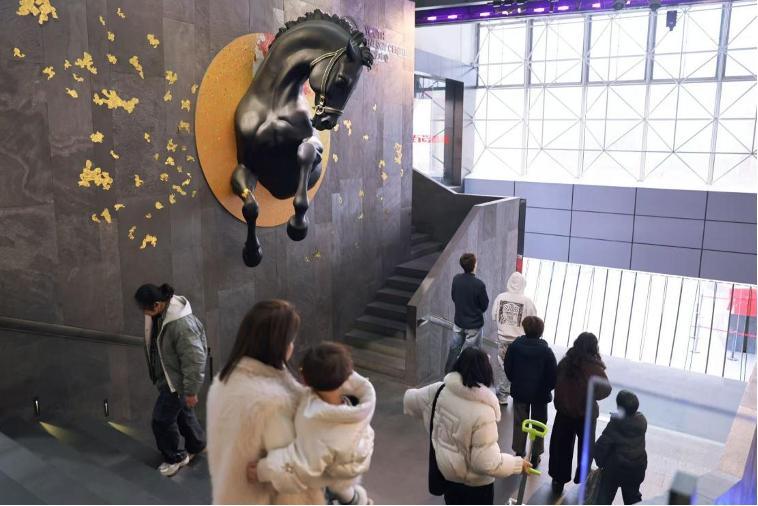 在百聯TX淮海,一匹極具視覺衝擊力的“巨型黑馬”美陳裝置,以衝破牆面的動勢傲立於主入口,將傳統生肖文化與現代美陳藝術深度融合。來到商場的年輕人,紛紛拿起手機“打卡”,有人解讀“新年要做一匹黑馬”,有人賦予內涵“春風得意馬蹄疾”,巨型黑馬成爲強內容的社交貨幣生成器。