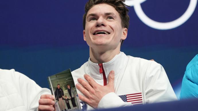 “我多希望他們坐在身邊,共同見證這一刻,抬頭看着分數牌。”等分席上,美國花滑選手馬克西姆·瑙莫夫眼含熱淚,親吻手中泛黃的全家福,那是3歲時與父母在冰上的合影。經歷難以想象的喪親之痛後,24歲的他帶着父母共同的心願,圓夢冬奧會男子單人滑舞臺。