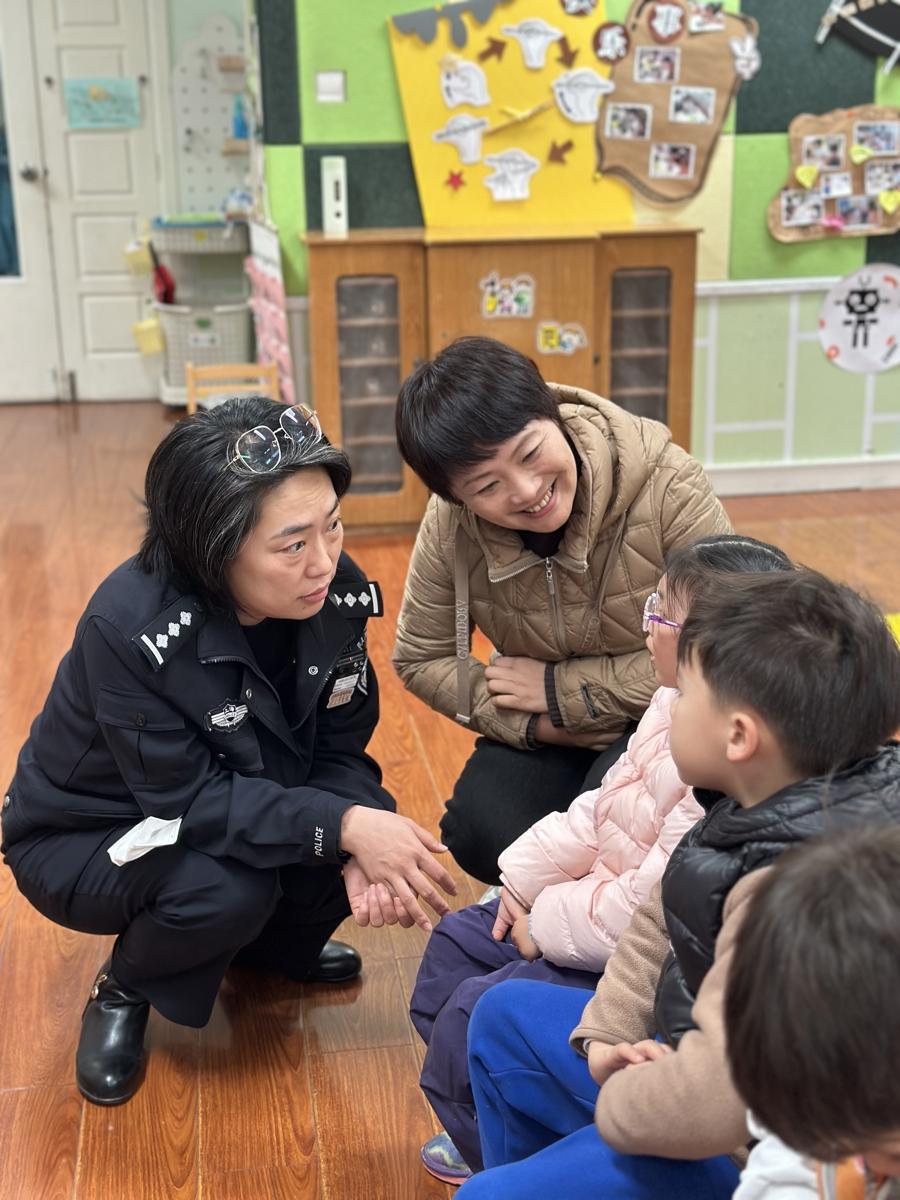 普陀區美墅幼兒園裏,園長和民警一起與小朋友互動