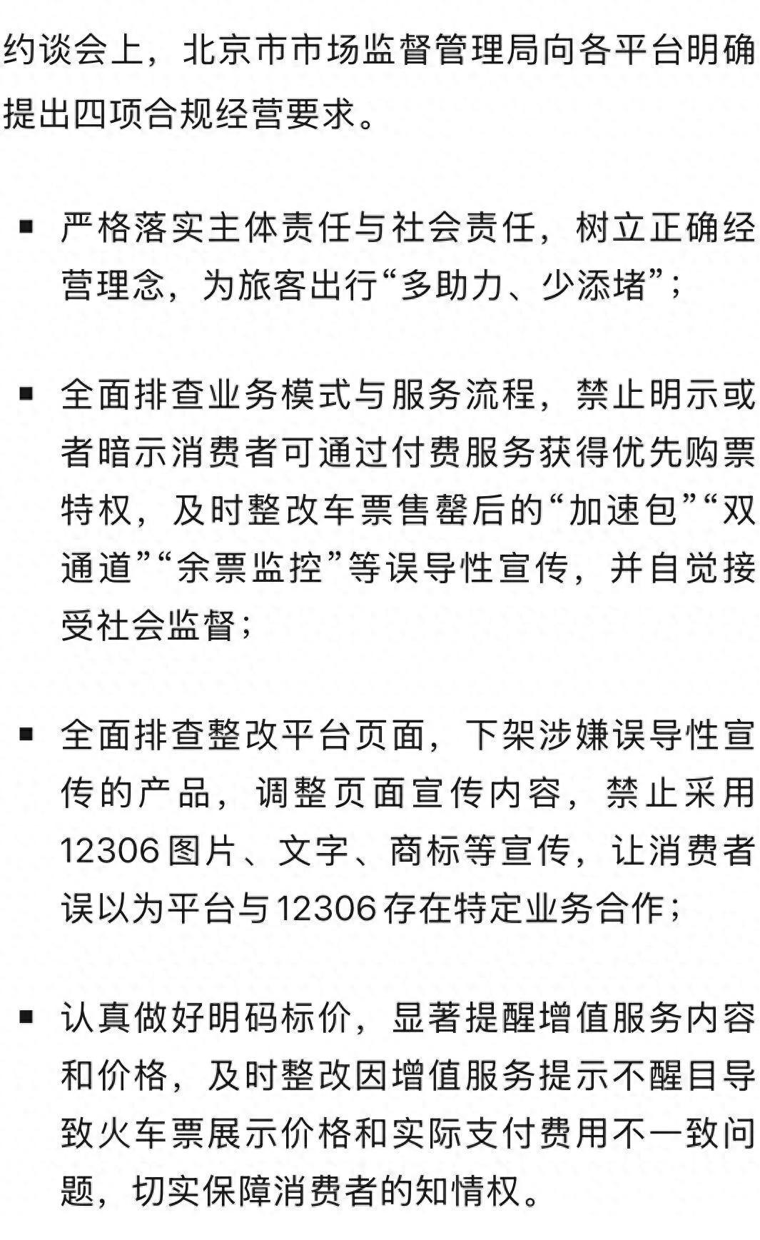 近日,北京市市場監督管理局組織攜程、去哪兒、飛豬、同程、美團、京東、航旅縱橫、高鐵管家、滴滴、高德地圖、百度地圖、騰訊地圖等12家涉及火車票網絡銷售業務的主流平臺,重點圍繞羣衆反映強烈的網絡銷售火車票突出問題召開行政約談會。