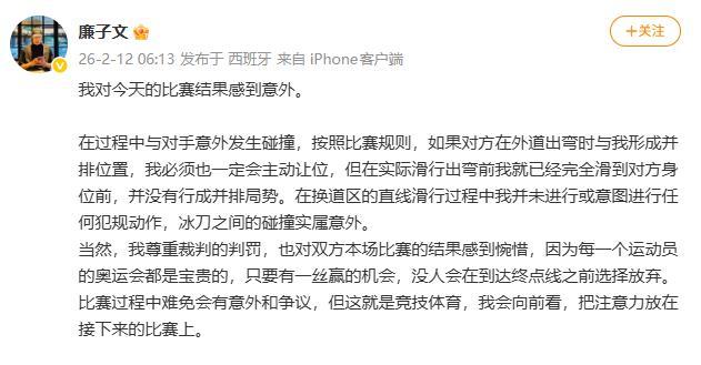 中國選手廉子文與荷蘭選手比賽時因冰刀碰撞被取消成績,賽後遭對方出拳擊打肩膀,本人回應
