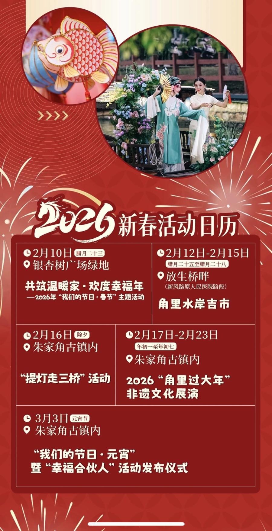 2月12日至15日,放生橋畔“角里水岸‘吉’市”將熱鬧啓幕,15家優質特色攤位涵蓋好物選購、互動體驗,青浦非遺展示點位更讓遊客近距離觸摸文化肌理,逛購之餘輕鬆定格新春美好;春節期間,船拳的剛勁、搖快船的靈動、崑曲的婉轉在古鎮街巷輪番上演,舞龍舞獅巡遊穿梭青石板路,鑼鼓喧天中爲遊客派送滿滿福氣。