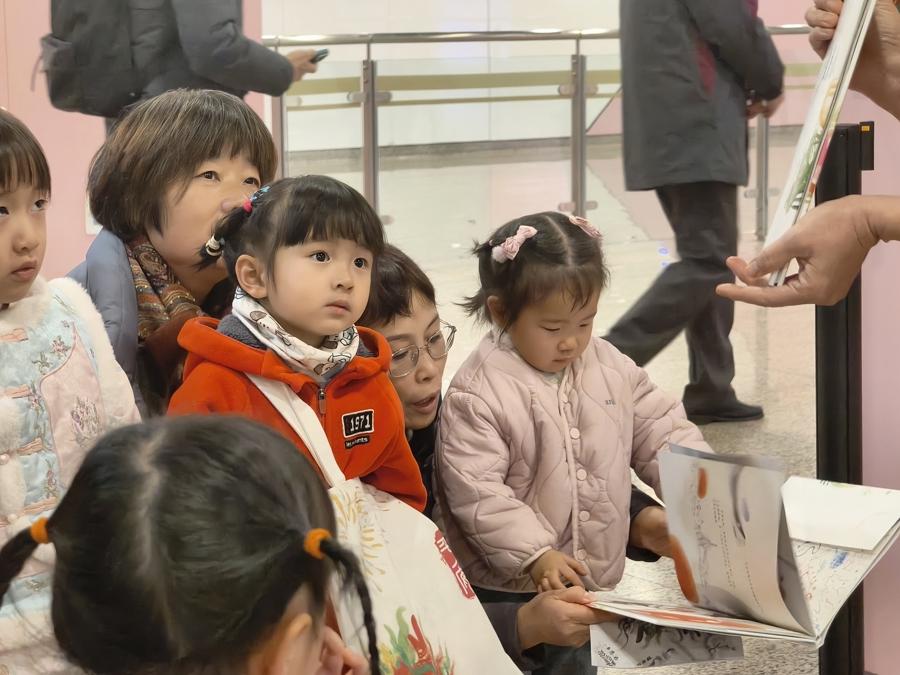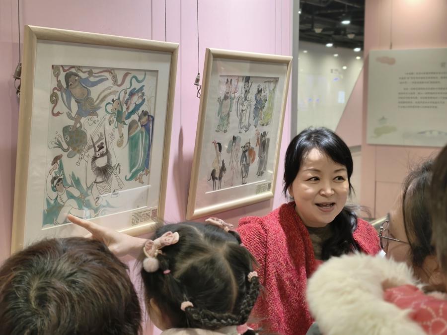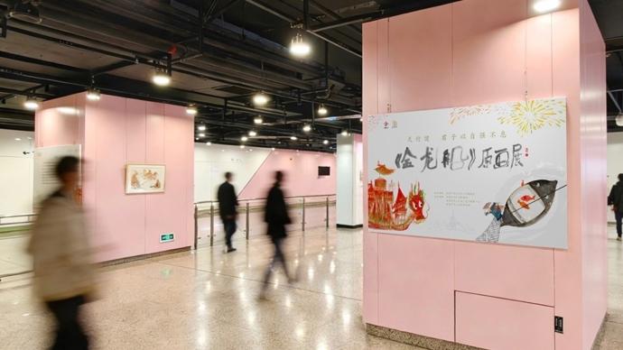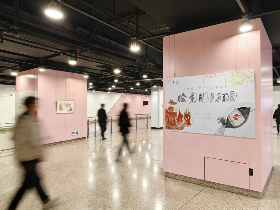在十五號線顧村公園站的站廳裏,《金龍船》繪本主編吳斌榮正帶着多組親子家庭駐足畫前,細細講解一幅幅水墨原稿背後的故事。“讓‘大肚皮’的故事,隨着地鐵運行的脈搏,陪伴市民的每一次出行,”她笑着說道,“正是選擇在這裏辦展的一份初心。”一位共同參觀的孩子家長也感慨道:“把‘羅店劃龍船’這樣地道的非遺故事,用水墨畫帶到地鐵裏,讓趕路的時間也變得豐富起來。”