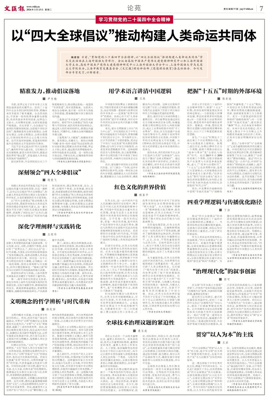 “四大全球倡議”是立足時代特徵、汲取人類智慧結晶的重大創新成果。它從發展、安全、文明、治理四個維度,系統回答了“世界怎麼了、我們怎麼辦”這一時代命題,爲變亂交織的國際局勢提供了寶貴的確定性,是推動構建人類命運共同體的中國方案。探討這一關乎人類文明走向的宏大課題,必須跳出一時一域的侷限,堅持全球視野與歷史眼光,將偉大建黨精神這一“精神之源”轉化爲應對新時代風險挑戰的強大武器。