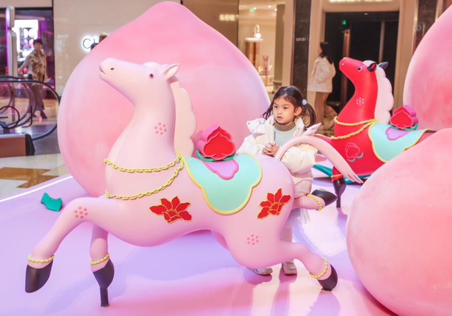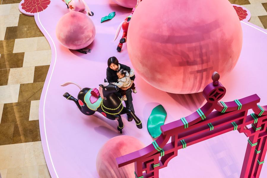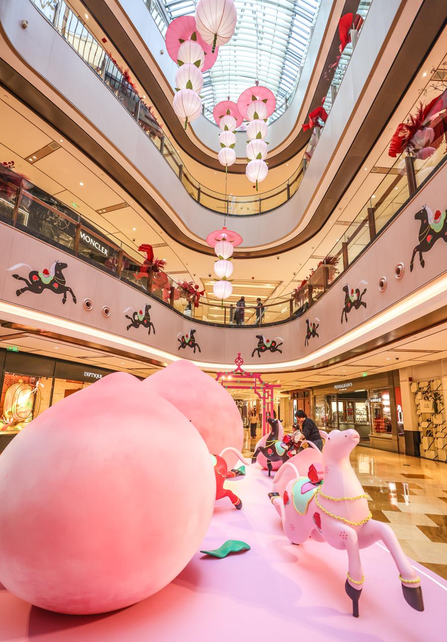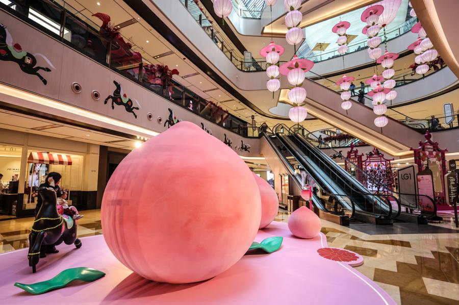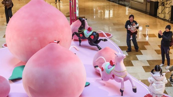 記者在現場看到,“一騎桃喜”新春活動季裝置遍佈興業太古匯全場多個點位,整體通過色彩、意象與結構相互呼應,營造出一個生機勃發、充滿希望與和合之美的沉浸式場域.