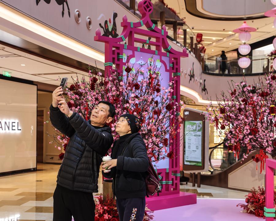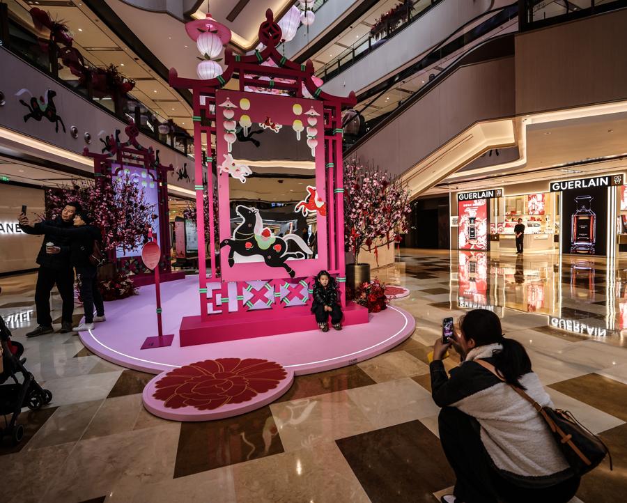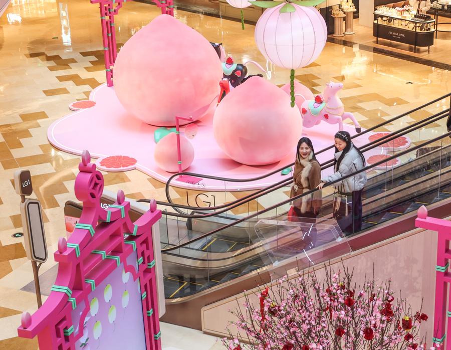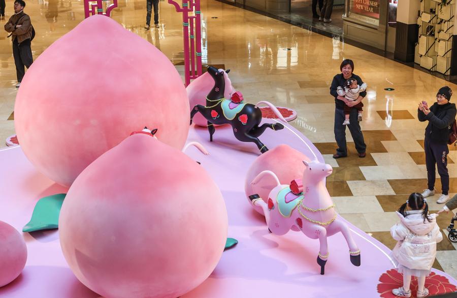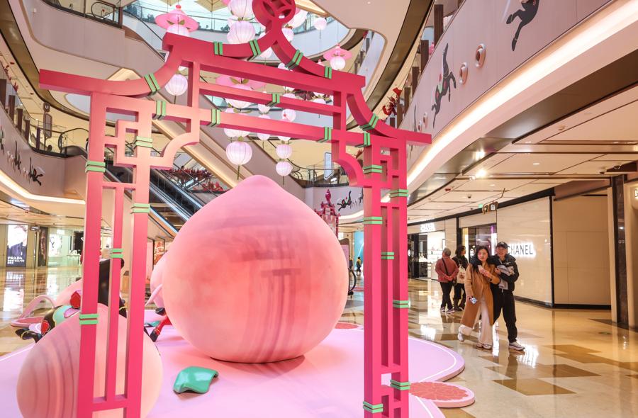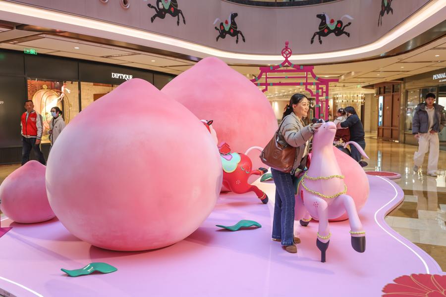 記者在現場看到,“一騎桃喜”新春活動季裝置遍佈興業太古匯全場多個點位,整體通過色彩、意象與結構相互呼應,營造出一個生機勃發、充滿希望與和合之美的沉浸式場域.