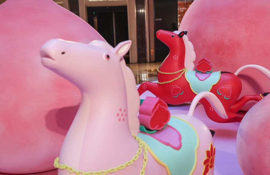 在LG1中庭,五個大小不一的“桃”形裝置象徵“五福臨門”。在中華傳統文化中,“桃”本身寓意着辭舊迎新,此次則以極具辨識度與張力的形態呈現,承載着深厚的文化意涵與節日祝願。不同顏色的馬呈現出騰躍之姿,穿梭於桃子之間,承載着多層文化指向,粉馬象徵柔和、生長與情感延續,紅馬代表節慶、熱烈與吉祥能量,白馬寓意更新與希望,黑馬則指向厚積薄發的內在力量,呈現出突破向上的銳氣與開拓新境的格局。