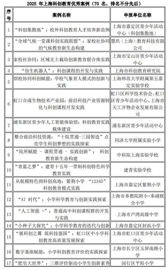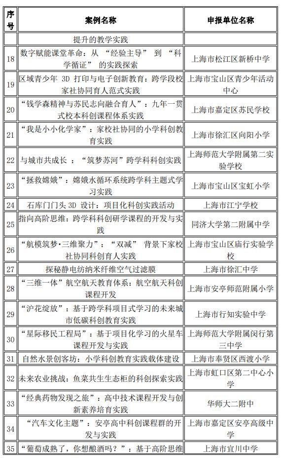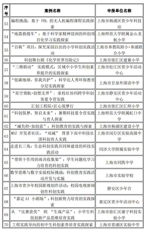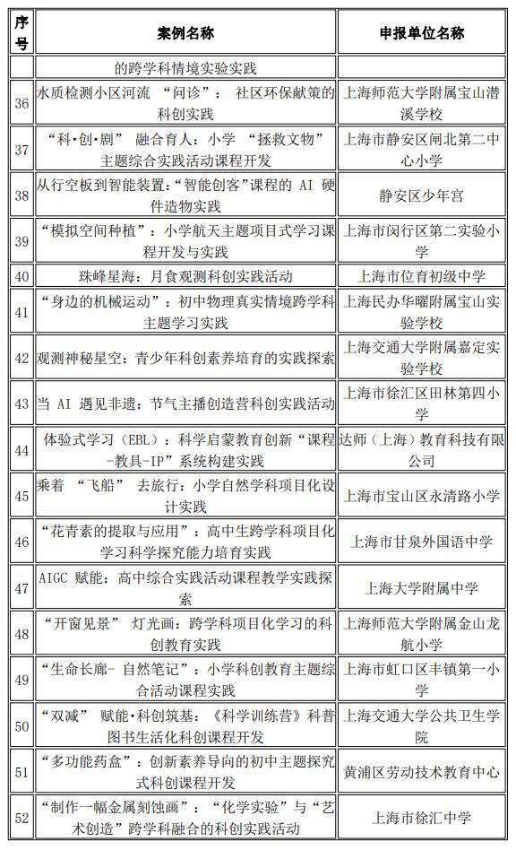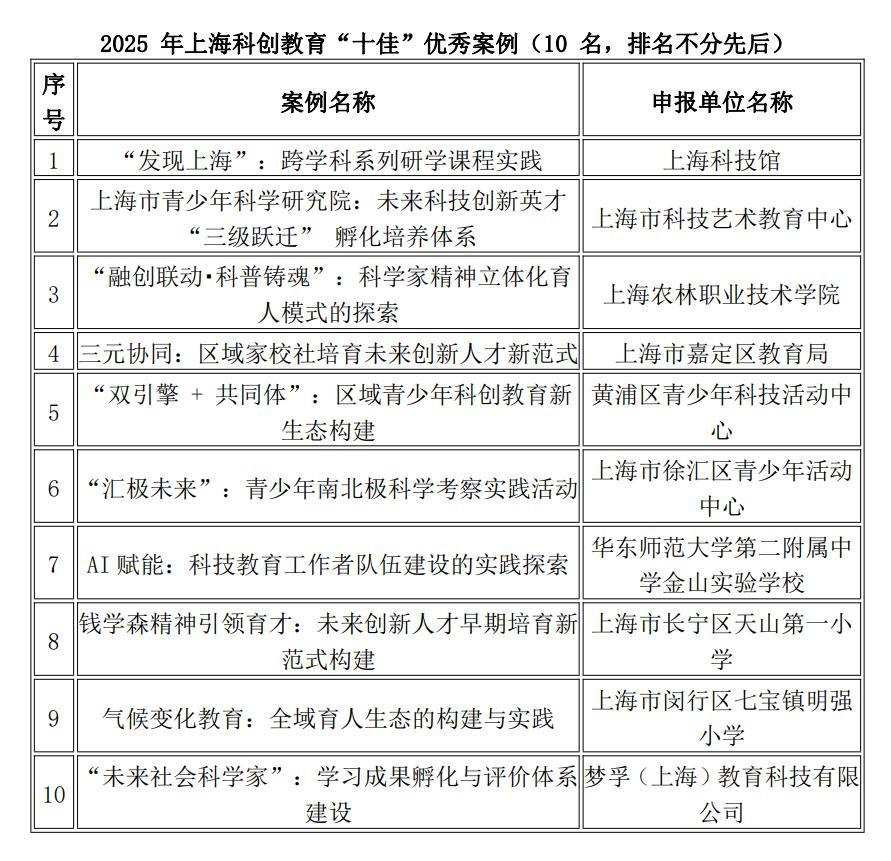 此外,上海農林職業技術學院、黃浦區青少年科技活動中心、閔行區七寶鎮明強小學等單位申報的案例也分別在科學家精神育人、科創資源聯動、氣候變化教育等方向形成可推廣經驗。