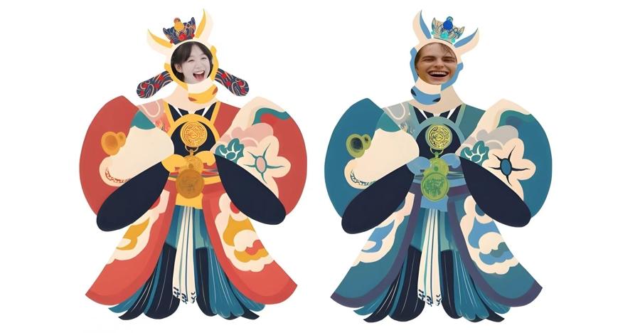 《人歡馬躍》是湯一祺創作的展板裝置。九組人馬身披傳統華服,綴少數民族紋樣,彷彿從節慶畫卷中躍出,攜東方韻律駐守馬德里。裝置以當代設計語言重構生肖符號,成爲中西節慶情感的藝術連接。