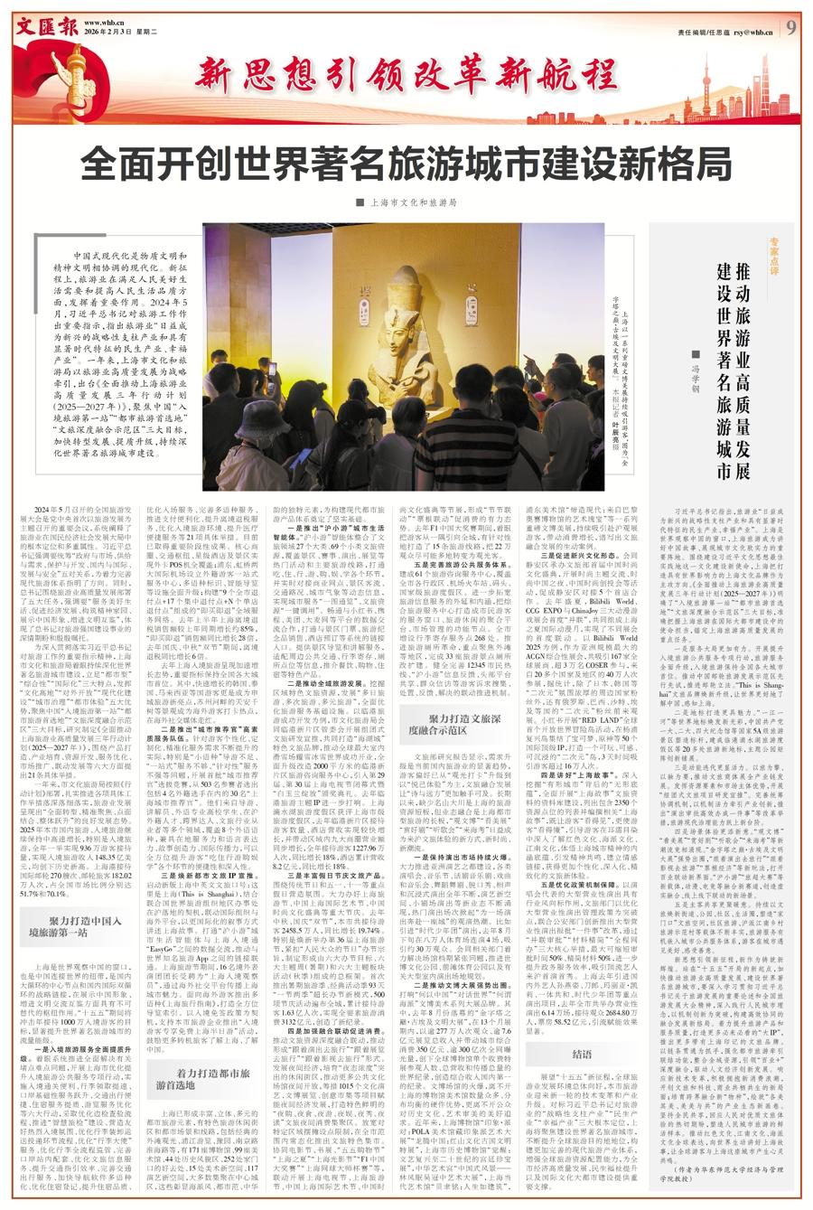 【編者按】中國式現代化是物質文明和精神文明相協調的現代化。新徵程上,旅遊業在滿足人民美好生活需要和提高人民生活品質方面,發揮着重要作用。2024年5月,習近平總書記對旅遊工作作出重要指示,指出旅遊業“日益成爲新興的戰略性支柱產業和具有顯著時代特徵的民生產業、幸福產業”。一年來,上海市文化和旅遊局以旅遊業高質量發展爲戰略牽引,出臺《全面推動上海旅遊業高質量發展三年行動計劃(2025—2027年)》,聚焦中國“入境旅遊第一站”“都市旅遊首選地”“文旅深度融合示範區”三大目標,加快轉型發展、提質升級,持續深化世界著名旅遊城市建設。