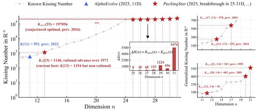事後證明,人機協同的研究模式獲得了顯著成果:在25-31維,打破了人類已知的最佳親吻數結構,同時打破了此前二三十年長期保持不變的14維與17維的“兩球親吻數”以及12維、20維與21維的“三球親吻數”。