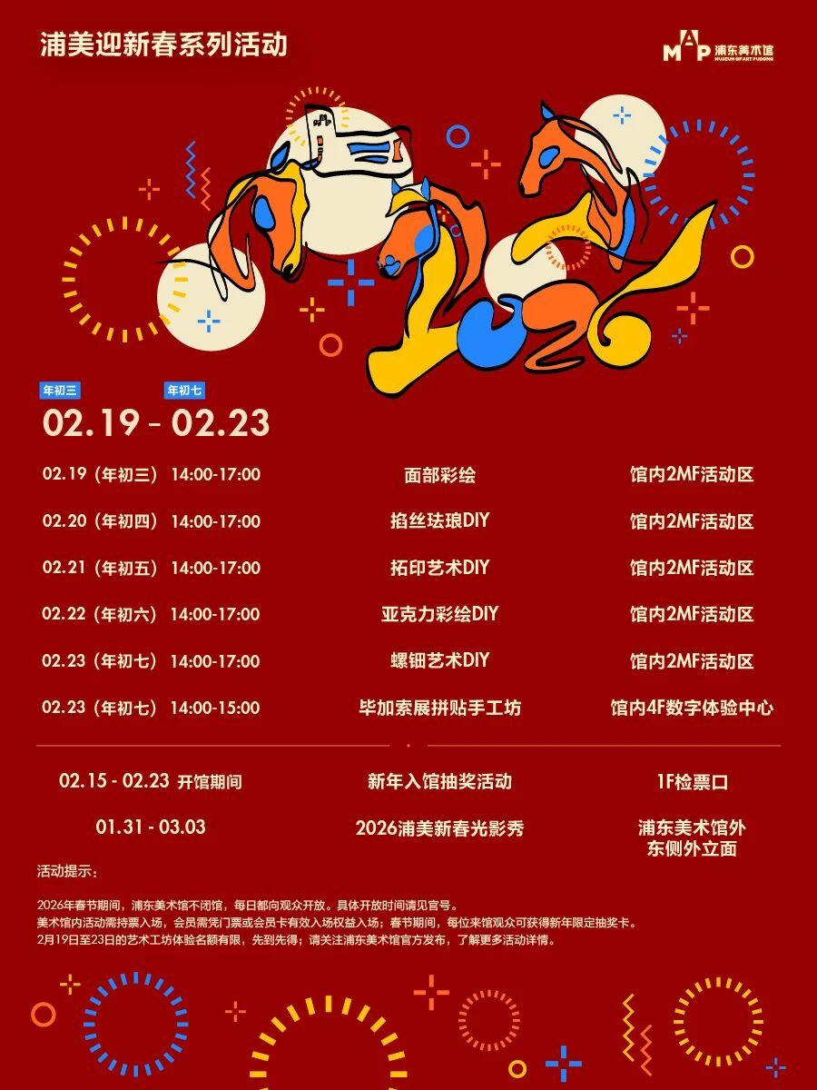 據悉,上海美術館(中華藝術宮)、上海當代藝術博物館、浦東美術館、劉海粟美術館、程十發美術館、上海中國畫院美術館、海派藝術館等不少美術館春節長假不打烊,更多的美術館大年初四開始正常對外開放,紛紛以藝術的方式回應傳統節日,不僅備上展覽盛宴,還精心策劃了一系列有趣的公教活動,爲馬年新春提供一種不同於節慶喧鬧的文化選擇。