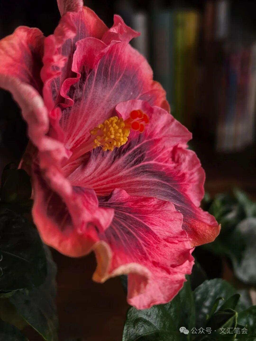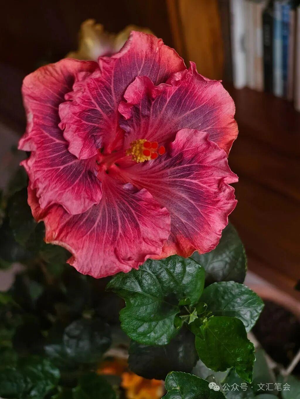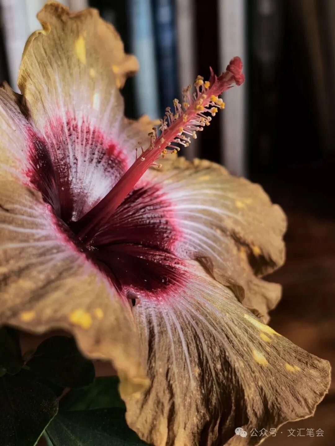 除冬天還能連續開花外,扶桑還有一個特點,那就是它的花多奇色。主要是其他種類的花沒有或很少有的紫黑、暗紫、灰紫色,還有黃褐、棕褐色,還有花瓣上不規則的色斑、脈紋等,花色還會隨氣溫高低發生變化。較早的時候我養過一盆橙色復瓣扶桑,這是中國的傳統品種。後來我還養了兩種奇色的扶桑,是2019年4月買的,到今年2026年已養了7年,每年冬天都在賞玩它們奇特的花色,至今沒有厭倦。其中一種叫“溼婆”(參見上、下圖:它的花心是深血紅色,花瓣是棕褐色,上面不規則地分佈着黃色斑點。冬天的時候棕褐色部分變深,黃色斑點減少。
