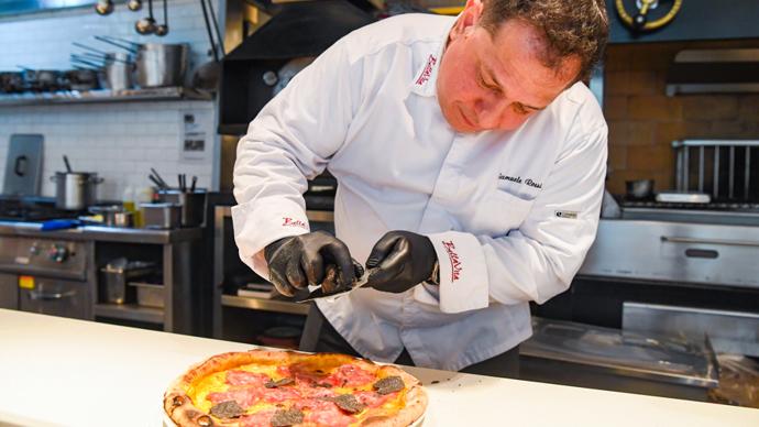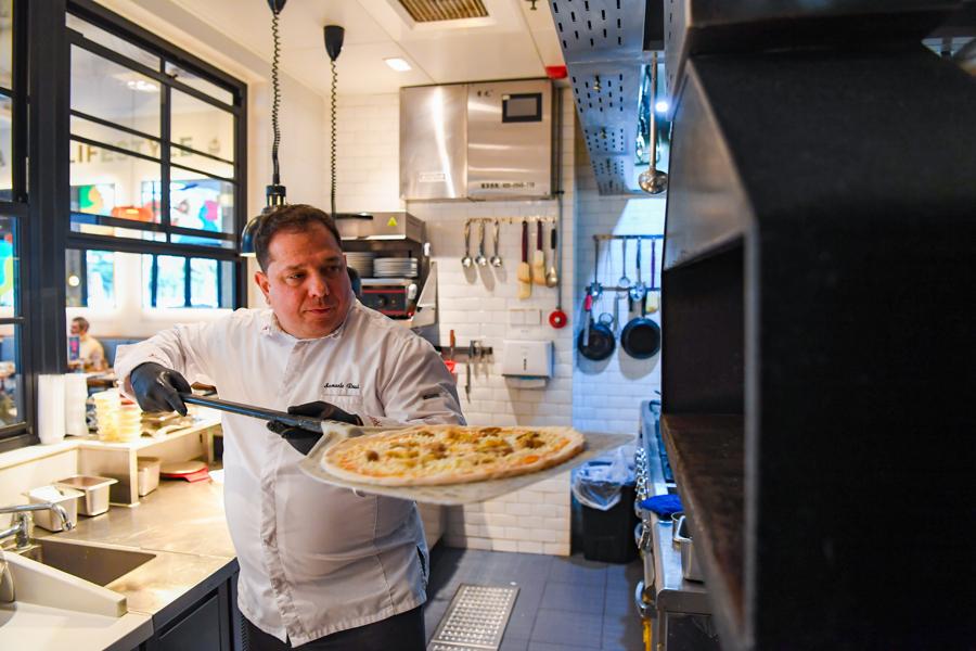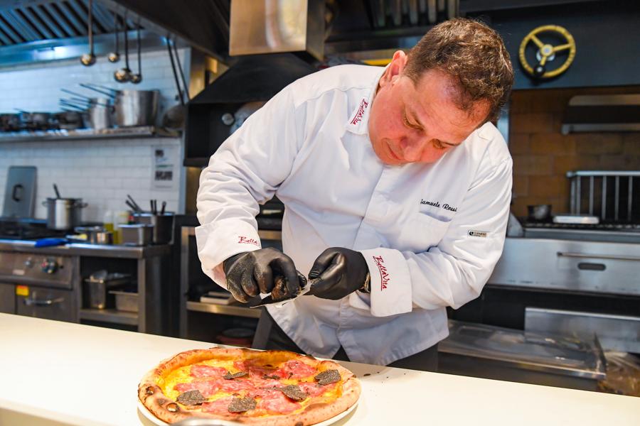 薩姆·羅西很忙。上午9點半,面試一位菲律賓應聘者,爲新店做準備;10點,接受媒體採訪,其間還處理了幾個電話會議;11點,他興致高昂地擼起袖子進後廚一展才藝,片刻之後,一個馬年限定的松露薩拉米披薩就出爐了。