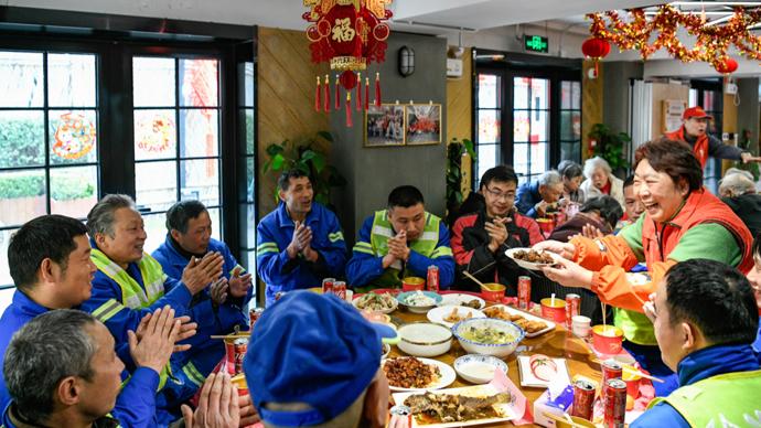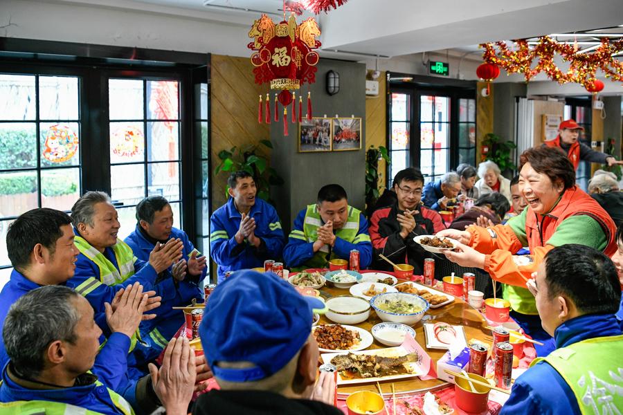 新春佳節臨近,日前,徐彙區天平街道的永嘉路492弄嘉園公共客廳內,“寶怡樂”團隊又張羅起了年夜飯。這已經是她們連續多年自掏腰包、親自動手,爲社區裏的老人和堅守崗位的戶外工作者操辦這頓團圓飯。