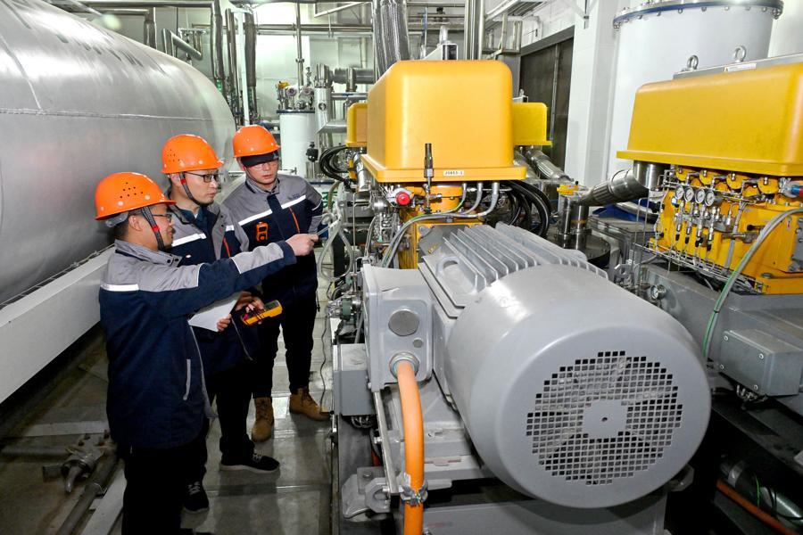 手持測氧儀,張大義在液氮泵房檢測空氣濃度。除夕這天,他仍不放心,帶着運維班組工程師們裏裏外外又檢查了一遍。