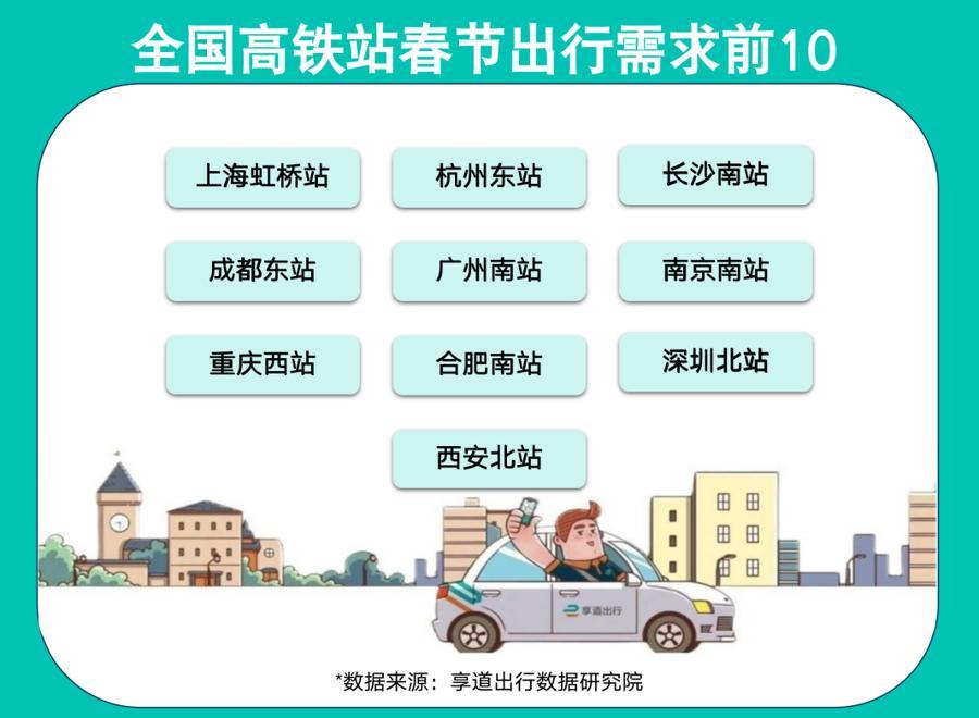 據往年春節出行大數據等情況,享道數據研究院綜合預測,今年春節期間,上海虹橋站、杭州東站、長沙南站、成都東站、廣州南站、南京南站、重慶西站、合肥南站、深圳北站和西安北站的往返旅客網約車出行需求排行全國前十。春節往返場站,享道出行建議優先選擇網約車+地鐵/公交的組合方式,避開擁堵路段,建議早出門30分鐘,預留充足時間,春節回家路上“從從容容、遊刃有餘”。
