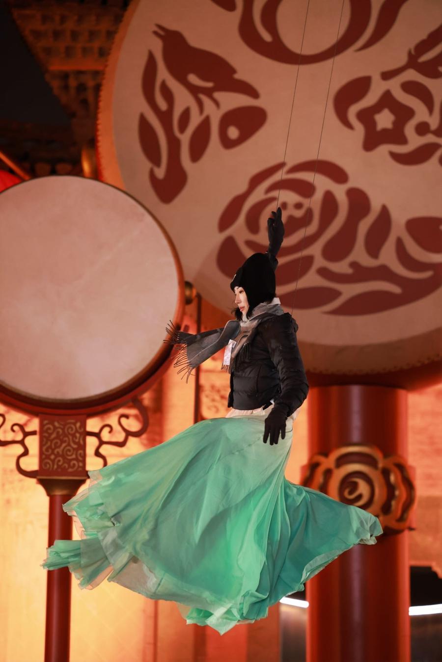 “世界首創”四個字背後,是一場持續八個小時的極限挑戰。1月底的義烏,夜間氣溫降至零下2度。朱潔靜身穿薄紗,被吊在離地數米的空中,成了冬夜裏孤獨而醒目的一抹亮色。風從四面八方湧來,穿透單薄的衣料。“不能貼暖寶寶。”她說,“任何一點凸起,都會破壞那種空靈飄逸的唯美。”