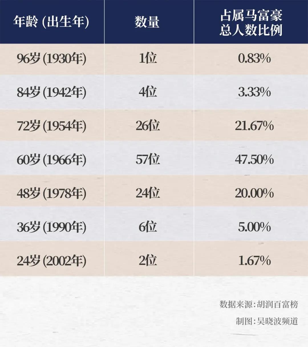 胡潤百富榜上榜富豪數量一共1434位,屬馬富豪一共120位。統計顯示,72歲、60歲、48歲三個年齡組爲核心羣體,三組合計107人,佔據屬馬富豪總人數的89%。
