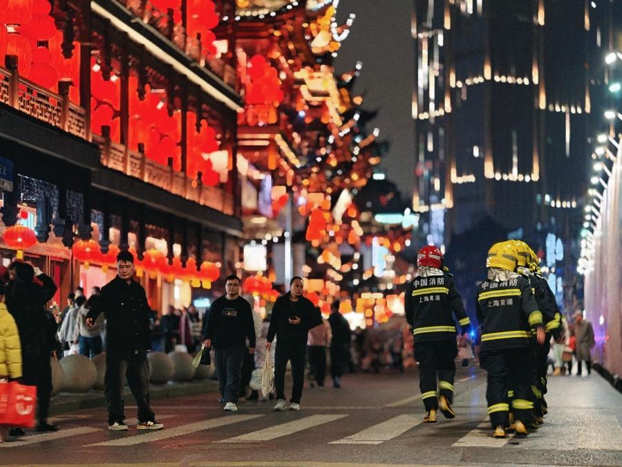 自小年夜起,黃浦消防全面啓動丙午馬年春節消防勤務,全隊伍進入超常規執勤戰備模式。在南京路、淮海路、豫園、新天地等重點商圈,城隍廟、白雲觀、法藏講寺等宗教場所,以及外灘、人民廣場等人員密集區域,黃浦消防的消防車、消防摩托車和指戰員全程駐防,多支社會面防火力量同步開展動態巡查,全力保障市民遊客平安過節。