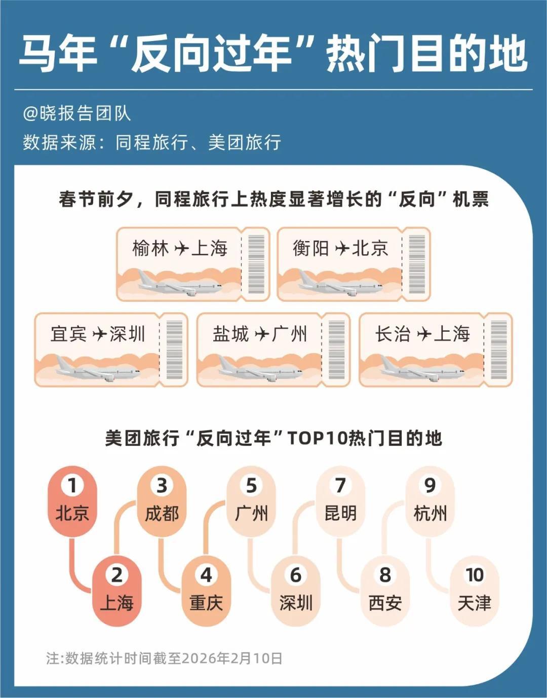 根據美團旅行數據,2月初至2月中下旬,“反向過年”機票預訂量同比去年增長84%。