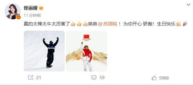演員佟麗婭在獲知喜訊的第一時間,用“真的太棒太牛太厲害了”盛讚蘇翊鳴,稱其爲“弟弟”,並表達“爲你開心、驕傲!生日快樂”。