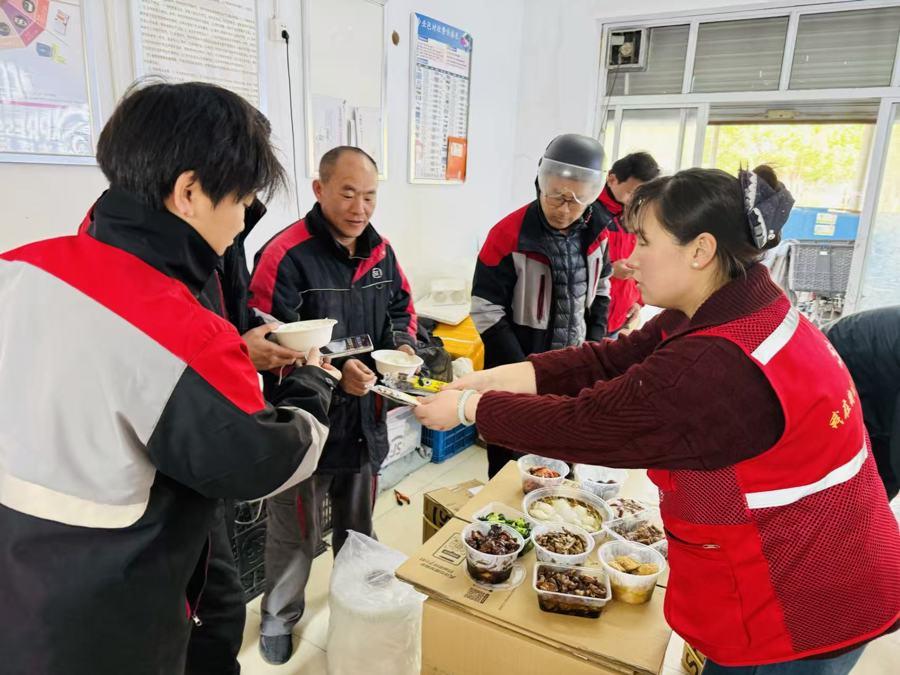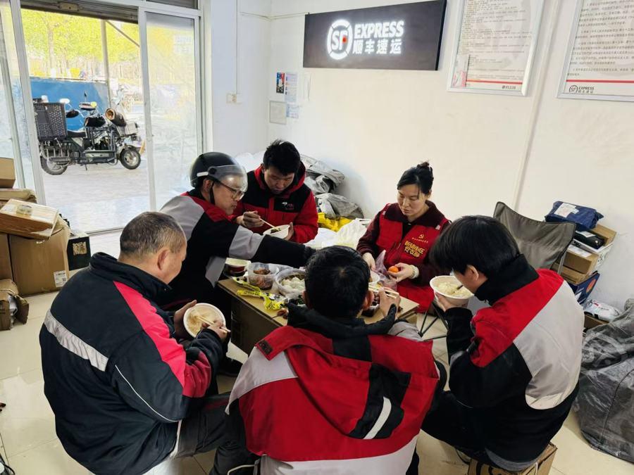 “非常感謝你們守護着萬家期盼,但是在滿足快遞準時到達的前提下也要注意安全啊。”新鎮街區黨支部書記王藝姣向快遞小哥們的辛苦堅守致以誠摯的感謝。她表示,春節期間,快遞小哥們穿梭在大街小巷,不僅保障了物資流通,更傳遞着親情與祝福,是城市運轉不可或缺的“毛細血管”。爲了讓堅守崗位的快遞小哥感受到家的溫暖,黨支部特意準備了這份代表感謝與慰問的年午飯。
