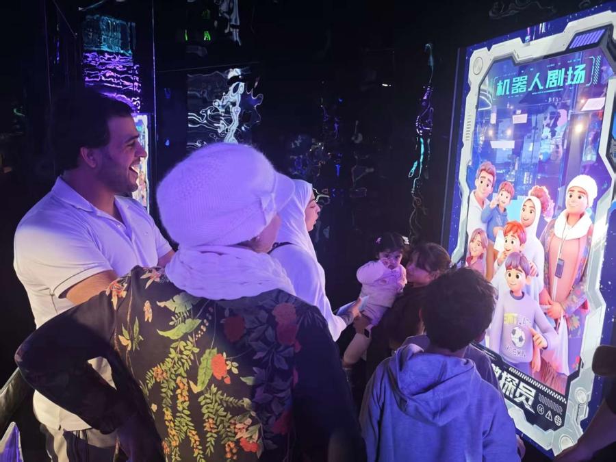 境外遊客對劇場的熱情,出乎她的意料。她記得,曾有來自中東地區的一家七口,先在AI智能拍照點前拍攝卡通全家福,接着參與了一場科學實驗秀,孩子們與機器人科學家互動,他們的父親在一旁感嘆:“我們是不是要被取代了?”