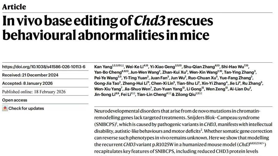 以自閉症爲代表的神經發育性疾病,困擾着無數家庭,長期以來“無藥可用”的困境讓患者家庭揹負沉重的身心與經濟壓力。北京時間2月19日凌晨,國際權威學術期刊《自然》在線發表一項重磅成果,爲這類疾病的基因治療帶來突破性進展。該研究驗證了腦內精準基因編輯的可行性,更讓全球神經發育疾病患者家庭看到了治療的曙光。