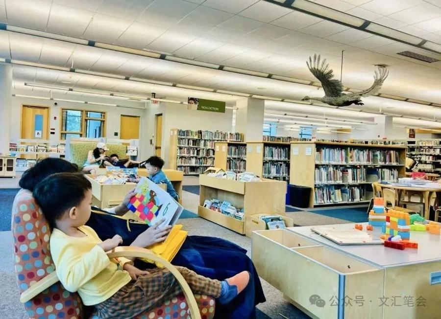 研究所負責接待的祕書是個三十歲出頭的得克薩斯姑娘,有個和我們孩子年齡相仿的兒子。第二天,她開車帶我去超市採購生活必需品,一路上細緻介紹了普林斯頓的各種親子活動,特別鄭重推薦了公共圖書館頂樓的兒童圖書區域。我和先生琢磨,全新的語言環境對幾乎是“文盲”的兄弟倆會是不小的挑戰,尤其是開口說話本就比較遲的弟弟,連說中文都還磕磕絆絆,更別說即將進入全英文環境的托育所。或許參加一些公衆的親子活動會有益於他們融入新的生活吧。於是剛安頓下來,我們就直奔普林斯頓公共圖書館辦卡。