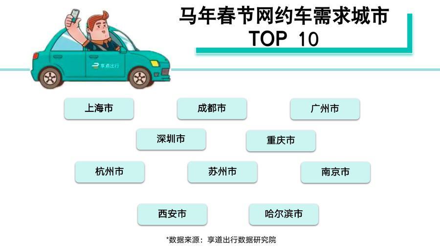 從出行需求熱度來看,上海、成都、廣州、深圳、重慶、杭州、蘇州、南京、西安、哈爾濱位列享道出行馬年春節中期出行熱門城市“TOP 10”榜單,其中,“冰城”哈爾濱首次入列。