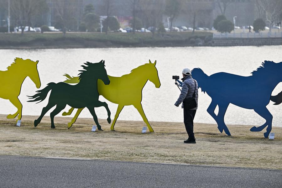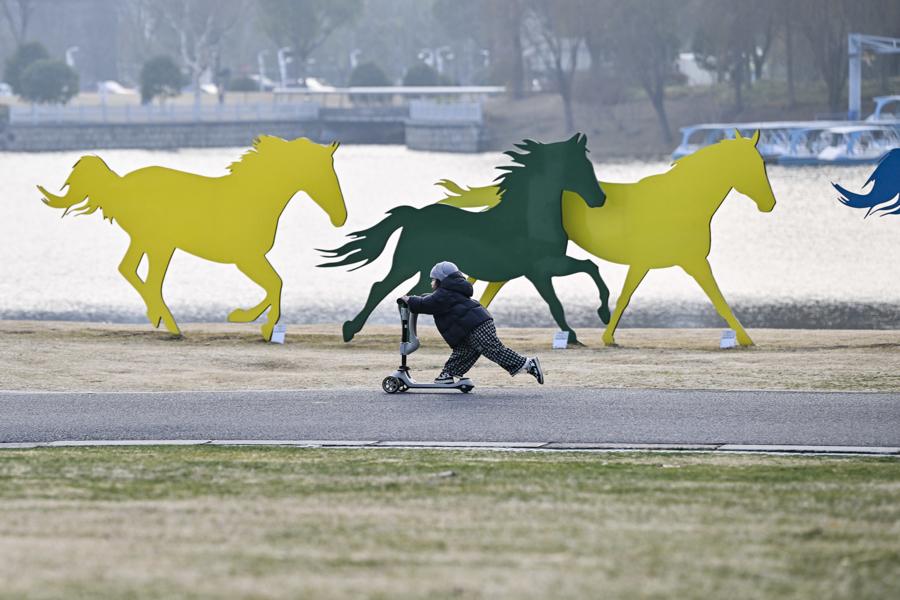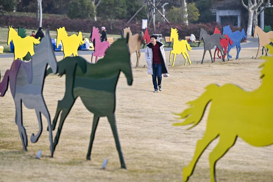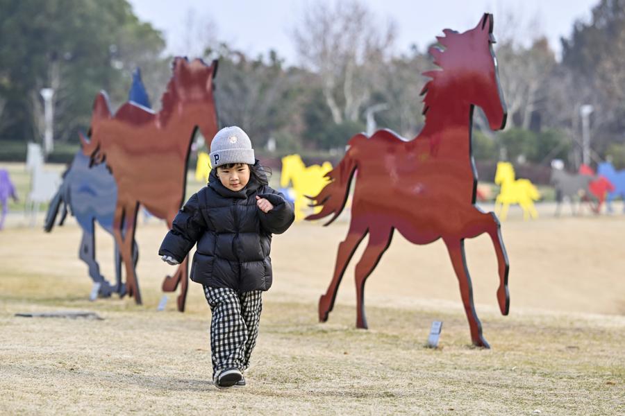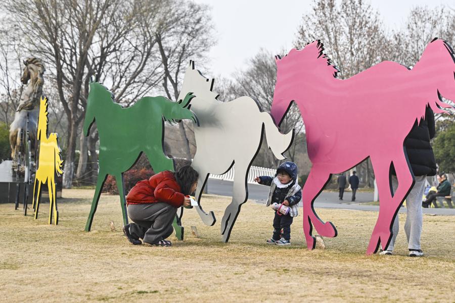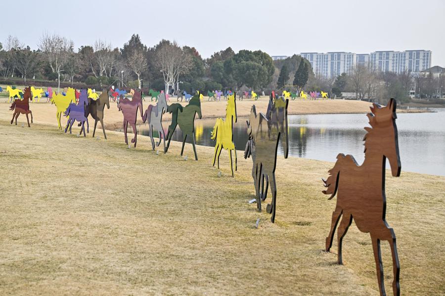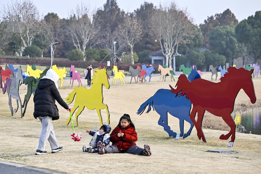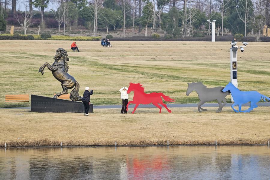 今年是馬年,申城有不少“馬”文化主題雕塑和裝置藝術。閔行文化公園是周邊市民日常休閒活動的必去場所。天氣晴好,不少父母帶着小朋友前來“萬馬奔騰”雕塑打卡在一旁的大草坪玩耍嬉戲。