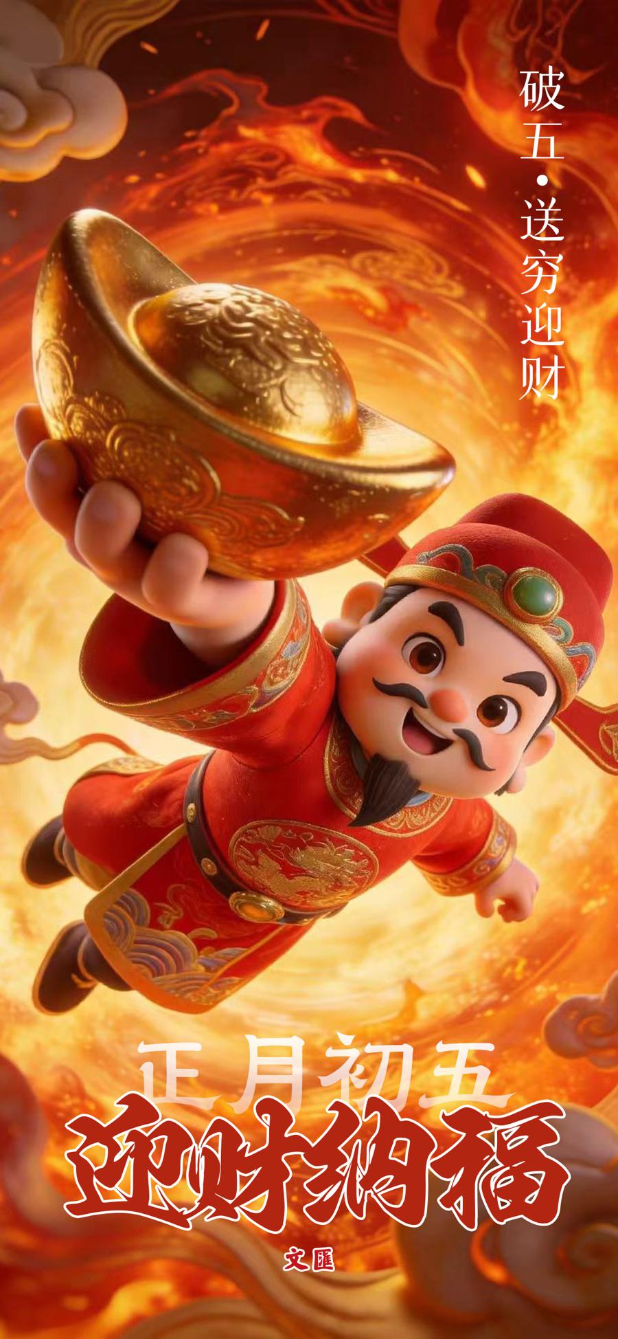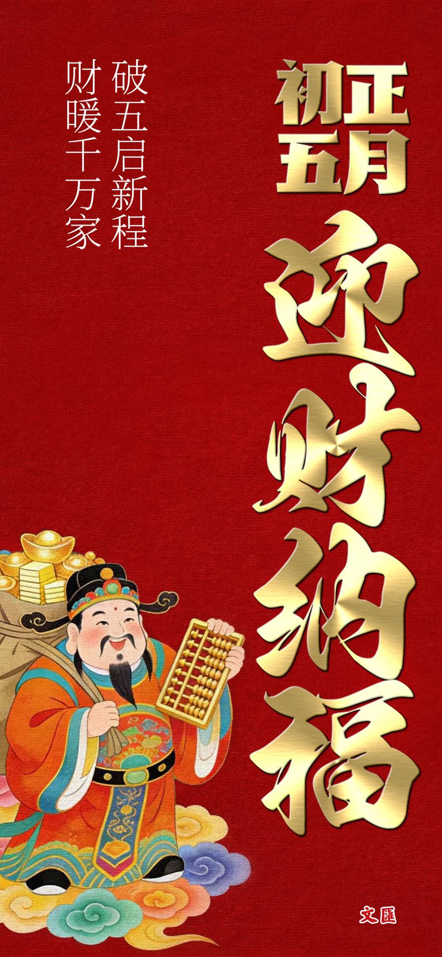 破五吉日,迎財納福。掃塵送窮辭舊歲,開門納祥迎五路財神。職場人蓄力前行,創業者篤志爭先。財氣伴福氣同行,奮鬥與希望共生。願丙午馬年,每份耕耘皆結碩果,聚八方瑞氣,繪就高質量發展的錦繡畫卷。