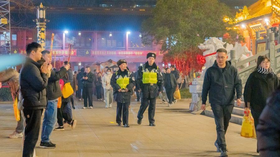 平安守護,不止於路。早在節前,王港派出所就會同廟方開展實地走訪,結合歷年客流數據和今年預估情況,精心制定應急預案和“一進一出”的蛇形單循環動線:香客從山門出發,經弘道橋、元寶島、立德橋進入廟內,沿老殿、銀杏古樹至財神殿,最後從東側北門離場,既有效避免人流對沖,又讓香客能沉浸式感受廟宇古韻。