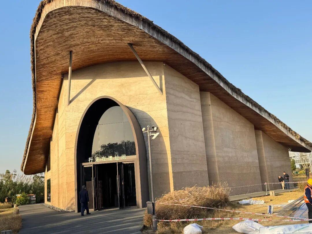 立在草鞋山遺址公園裏的展廳外觀非常特別,整幢建築是菱形的,古樸簡陋得彷彿是史前一個潦草的穴居地,覆着稻草狀物質的屋頂向兩旁微微上翹,宛若鳥兒展開的翅膀,而外牆乍看粗糙,實則精心設計成褐色的考古文化層,肌理既豐富又生動。